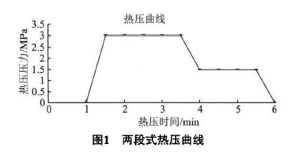 研究選取兩段式的熱壓曲線(如圖1),在較高壓力,熱壓時間,熱壓溫度等熱壓參數不變的條件下,添加不同含量的改性劑壓制門板,測出吸塑門板的靜曲強度、內結合強度等力學性能指標,研究角蛋白改性劑對吸塑門板質量的影響并分析掌握角蛋白改性劑添加量對吸塑門板質量影響的規律,進而得出控制板材較佳性能的工藝參數。