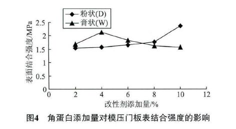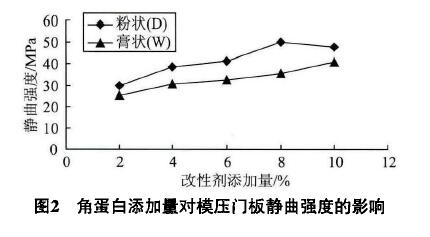 1)為了研究角蛋白改性劑對板材性能的影響,分別添加粉(D)、膏(W)狀角蛋白改性劑,添加量均為2%、4%、6%、8%和10%壓制模壓板進行單因素試驗,測定其靜曲強度、內結合強度、表面結合強度、吸水厚度膨脹率和甲醛釋放量等,確定制作吸塑門板的較優方案。
