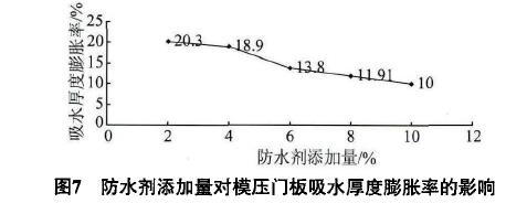 為了提高模壓纖維板的耐水性能,加入自主研制的防水劑(不飽和二元酸與多元醇按質量比3:1混合)研究對其耐水性能的影響,以確定在保證吸塑門板吸水厚度膨脹率合格條件下的較優方案,試驗結果見圖7。